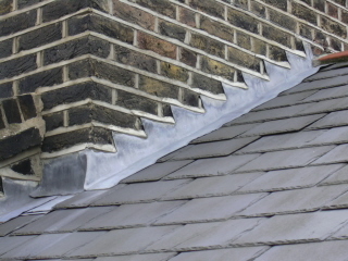 NEW OR OVERHAUL AND REPAIR. Roof shown is covered with Welsh slate and lead flashings. to party walls. All repairs undertaken including tile and slate, guttering / down pipes and fascias. REPOINTING to chimney stacks and party or parapet walls. Remove or replace chimney pots.